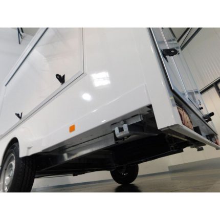Hayon latéral relevable avec vérins à gaz côté droit (ou gauche sur demande), hayon arrière et porte sur la face avant avec marche pied sur la flèche.