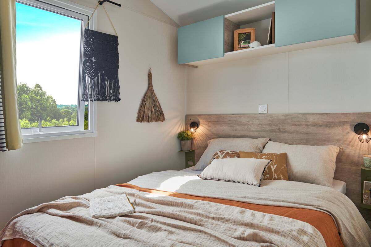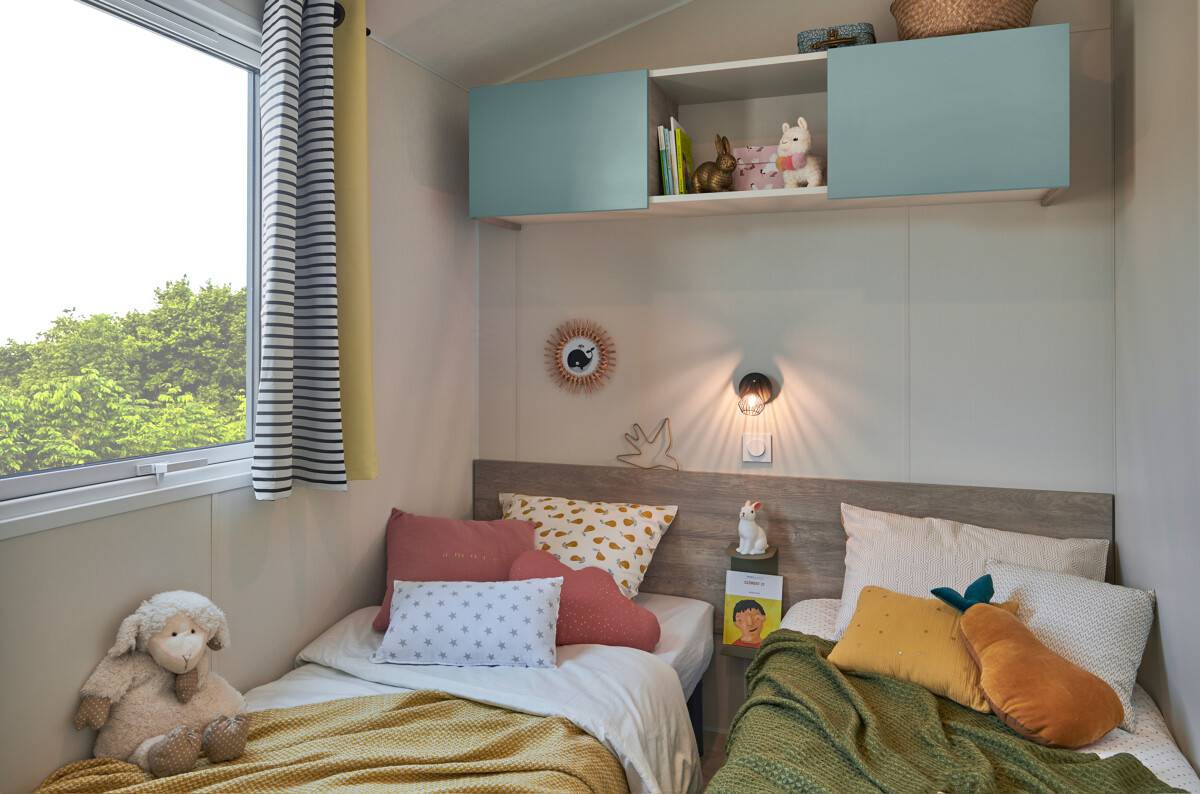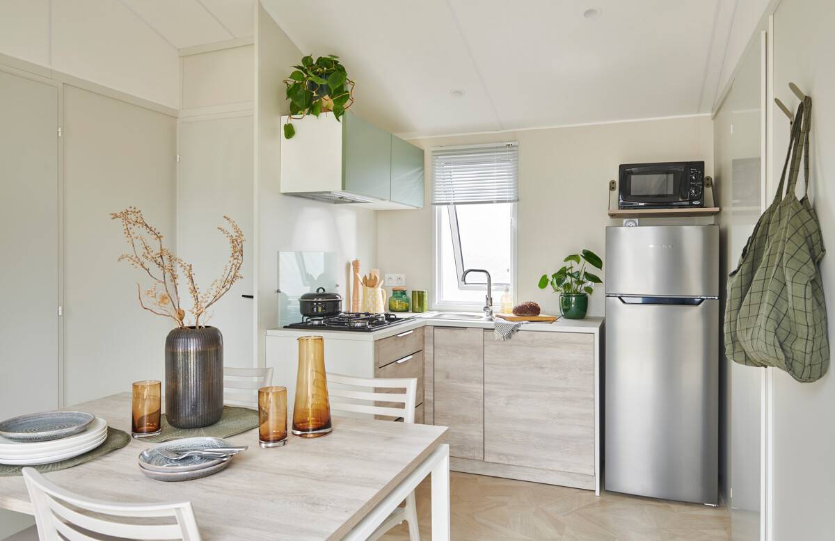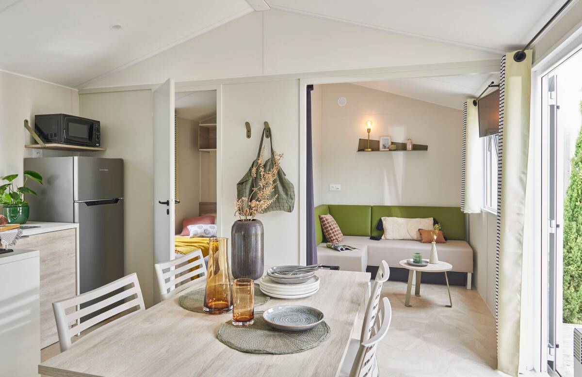 Le modulo 72.2 est le modèle qui permet tous les changements de programme ! Selon sa configuration, il permet en effet de disposer, au choix, de 2 ou 3 chambres. L’ensemble formé par la cuisine en L et la salle à manger est bien séparé du salon, un espace à part conçu spécifiquement en retrait de la pièce de vie. Grâce à un grand rideau occultant et à un canapé avec système convertible en option, cet espace peut se transformer en 3e chambre en quelques minutes ! Les espaces de rangements, la belle taille des pièces de vie et les deux chambres principales bien équipées rendent le modèle modulo 72.2 unique et très fonctionnel. Et dans ce modèle, la douche est en 80 X 100 cm de série !