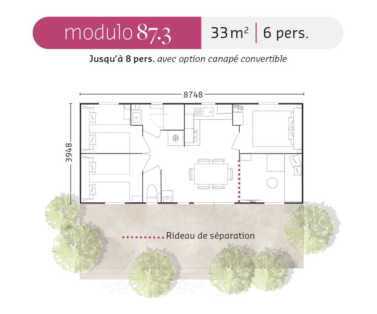 Dans 33 m², le modulo 87.3 propose un salon excentré du séjour en plus de ses 3 chambres. Doté d’un canapé à système convertible en option et d’un rideau de séparation, ce salon peut se transformer en quelques instants en une 4e chambre tout confort… Cette modularité est un véritable atout. Elle permet tous les changements de programme de dernière minute… Ce salon déporté fait la part belle à la cuisine et à un véritable coin repas. Côté chambres, place à l’espace, au confort et au rangement. Si les 2 chambres enfants sont équipées de lits de 80 cm X 190 cm de série, il est tout à fait possible d’installer un lit bébé à la place d’un lit enfant.