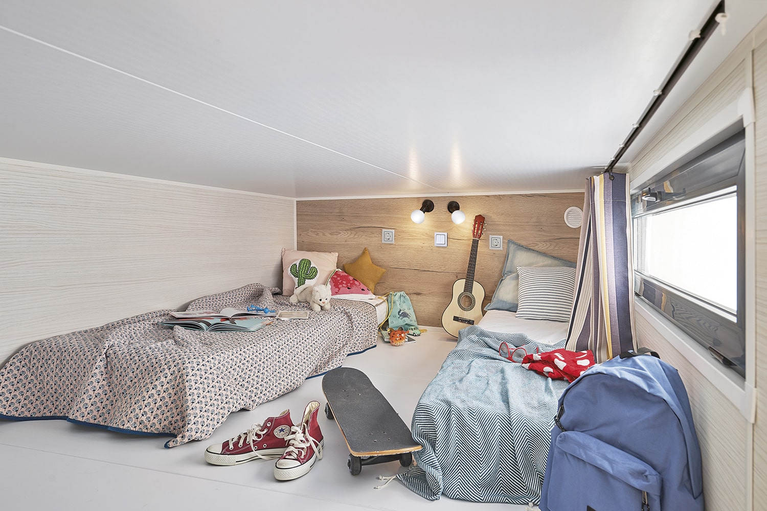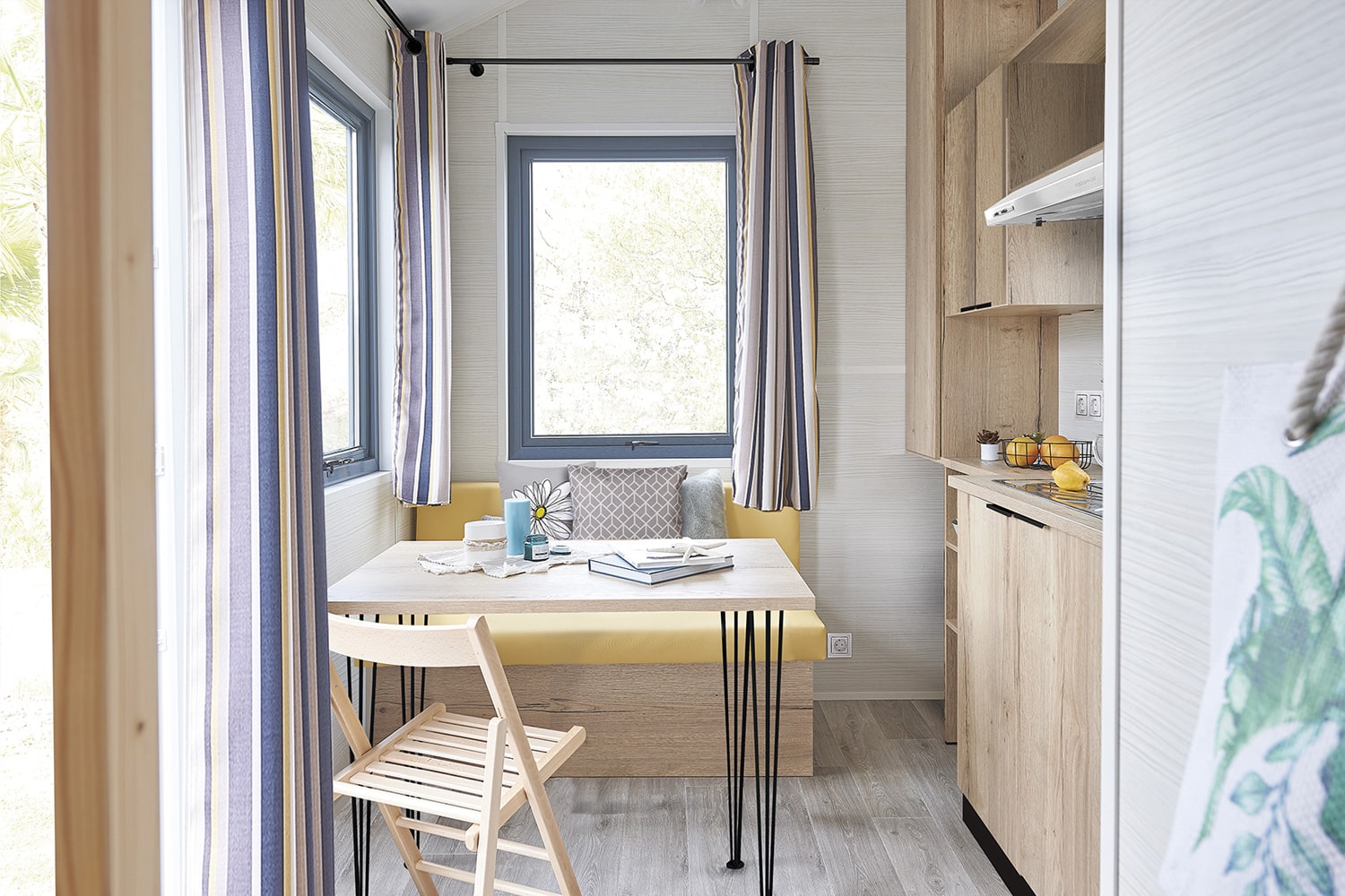 Dans notre espace salon/séjour, une banquette douillette, revêtue d’un tissu vinyle résistant, vous invite à vous détendre après une journée bien remplie. Les rideaux occultants vous offrent l’intimité souhaitée, tandis que le passage fluide à travers les portes intérieures à 59 cm garantit une circulation aisée.